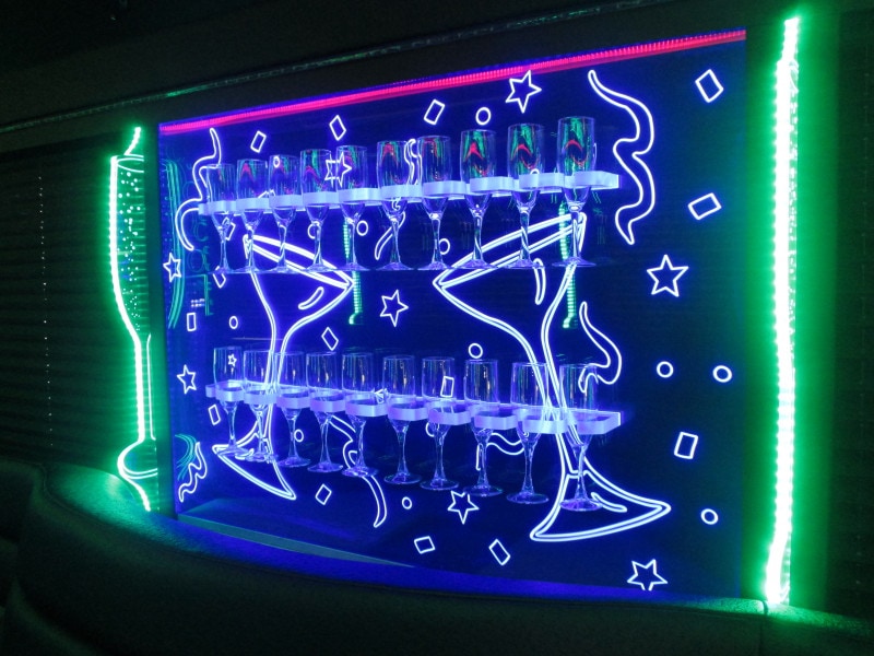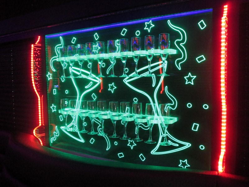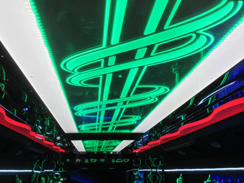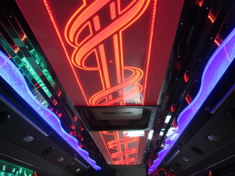 The interior has black leather with black pit perimeter seating, brown imitation wood flooring, a stainless steel, color-pattern changing ceiling, and 8-color “wash” lighting. Wash, or color wash, lighting means the floor, ceiling, and/or walls will absorb the chosen color of light. The bus also features champagnes glass lights that change color to add to the party.
